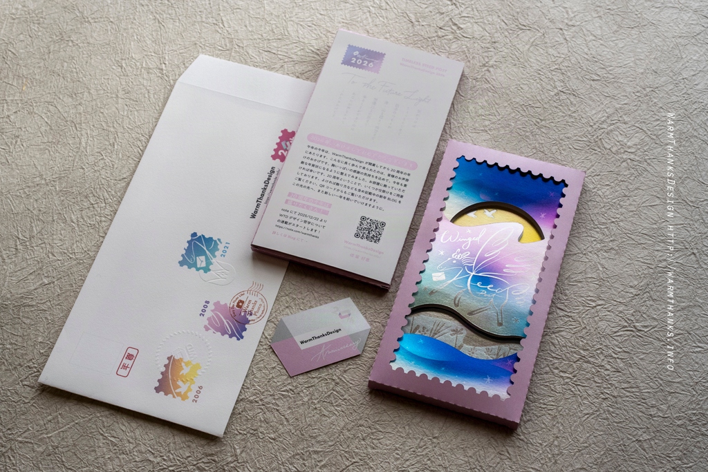 そこからの絵の展開もさることながら切手をイメージさせるような箱になっていたりします。その流れで封筒側(一番上)も切手っぽいデザインに対し、これまでエンボスやスタンプ作ったものを消印風に押印しています。
